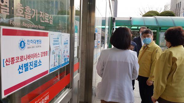 홍인성 인천 중구청장은 지난 29일부터 30일까지 이틀간 코로나 바이러스 감염증 선별진료소인 중구보건소, 인천기독병원, 인하대병원과 인천국제공항의 중앙검역의료지원센터를 전격 방문해 의료진과 직원을 격려하고 진료소를 점검했다.
