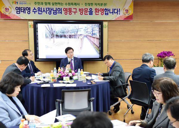 영통구에서는 광교지구 도로환경 개선, 수원가정법원 도로 개선, 광교 이의초교 통학로 환경 개선, 노후 공원시설 개선 및 정비, 원천동 저류지 환경 개선, 망포역 공공공지 본래기능 회복, 성죽공원 함양지 정비, 행정복지센터 건립 등이 현안으로 논의됐다.