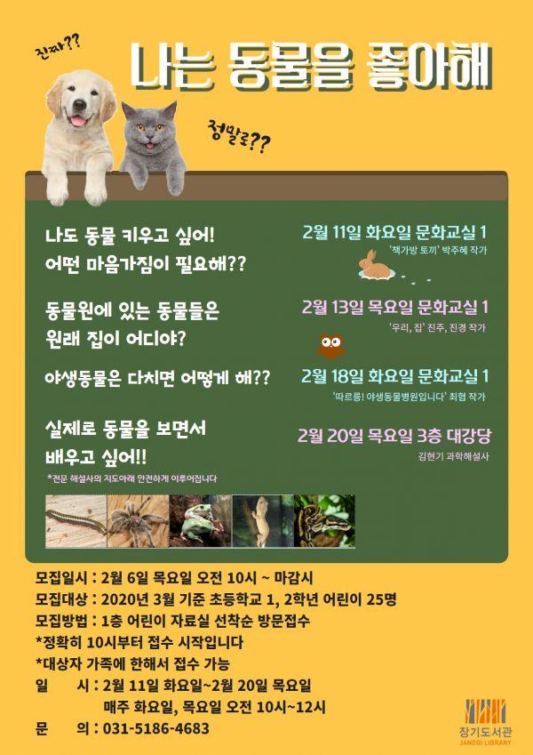 김포시 장기도서관은 예비 초등학교 1, 2학년 학생 25명과 함께하는 ‘나는 동물을 좋아해’ 강좌를 운영한다.
