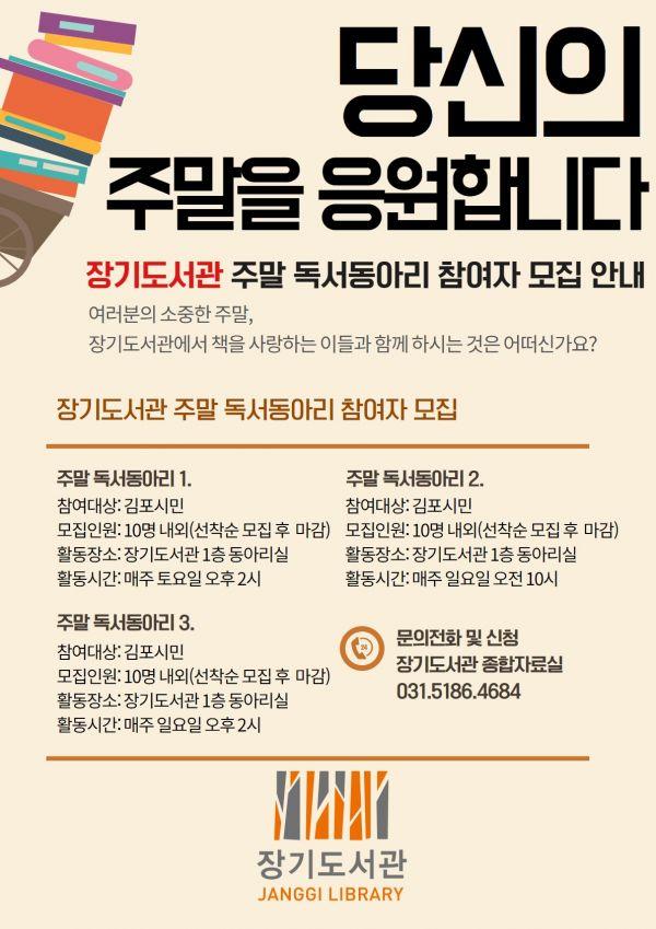 김포시 장기도서관은 주말 시간을 활용한 시민 주도의 커뮤니티 활성화를 위해 2020년 주말 독서동아리 회원을 모집한다.