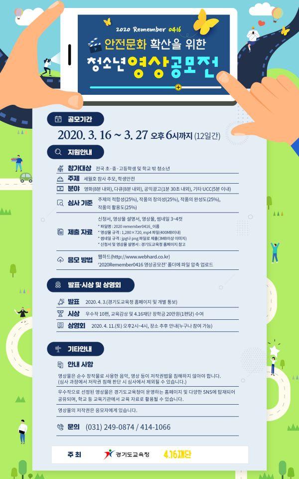 경기도교육청이 세월호 참사 6주기를 맞아 희생자를 추모하고 안전문화를 확산하기 위해 4.16재단과 함께 ‘2020 Remember 0416 청소년 영상공모전’을 진행한다고 3일 밝혔다.