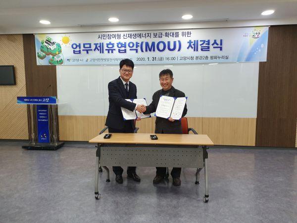 고양시는 지난달 31일 시청 평화누리실에서 한찬희 기후환경국장, 박평수 고양시민햇빛발전사회적협동조합 이사장, 조현숙 고양시의회 환경경제위원장 등 30여명이 참석한 가운데 시민참여형 신재생에너지 보급·확대를 위한 업무제휴협약을 했다고 밝혔다.