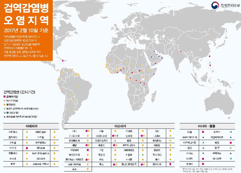 질병관리본부에서는 해외에서 발생한 감염병의 국내 유입을 예방하기 위해 세계보건기구(WHO), 세계보건규칙(IHR), 현지공관 등에서 보고한 감염병 정보를 바탕으로 *검역감염병 오염지역을 지정하여 검역업무를 수행한다. *검역감염병 : 해외에서 발생하여 국내로 유입될 가능성이 있는 감염병으로 검역법으로 지정(동물인플루엔자인체감염증, 콜레라, 페스트, 황열, 중증급성호흡기증후군, 신종인플루엔자감염증, 메르스, 폴리오, 에볼라바이러스병)