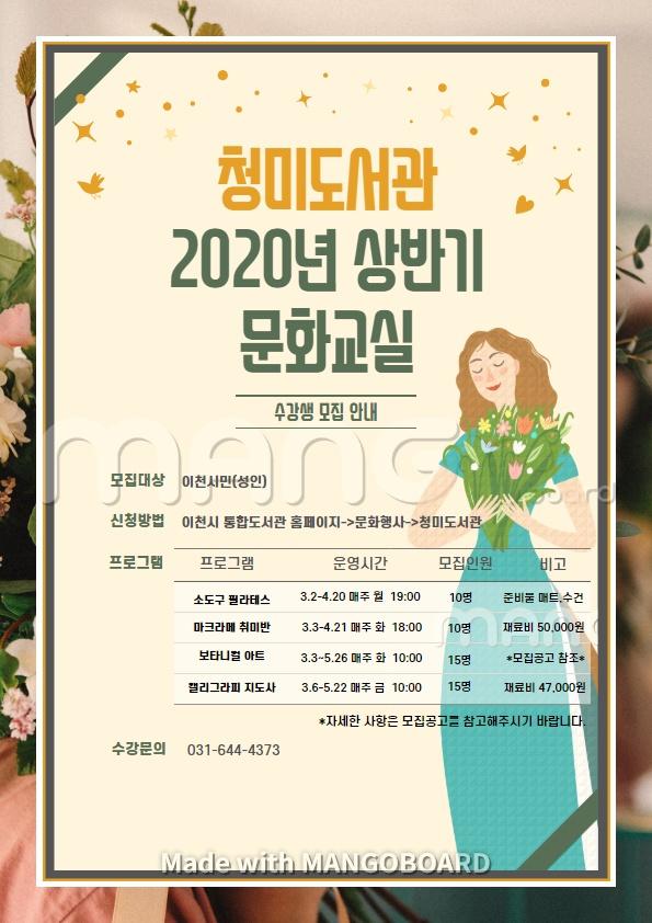 이천시 청미도서관은 시민들에게 평생학습 및 문화 활동의 기회를 제공하기 위해 3~5월 상반기 청미문화교실을 개최한다.