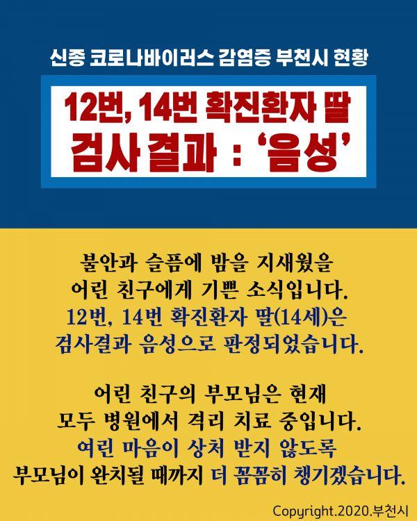 부천시는 12번, 14번째 확진 환자 자녀의 감염증 검사 결과가 ‘음성’으로 나왔다고 밝혔다.