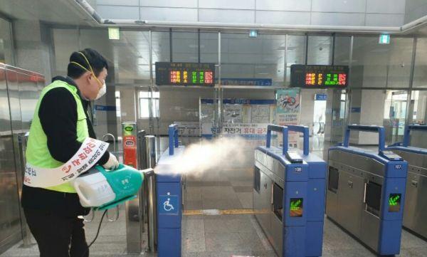 고양시가 신종 코로나바이러스 확산 방지를 위해 총력전을 기울이고 있는 가운데 고양시사회적기업봉사회에서 지난 1월 31일 경의중앙선 관내 8개 역사에 방역소독을 실시했다고 밝혔다.