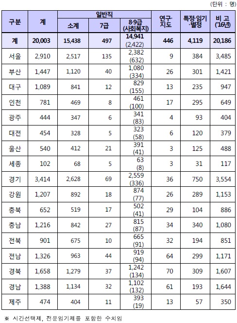 직종별로는 7‧9급 공채 등 일반직이 15,438명, 특정(소방)‧임기‧별정직이 4,119명, 연구‧지도직이 446명이다.