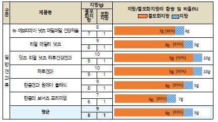 조사대상 12개 제품의 평균 지방 함량은 1일 영양성분 기준치 대비 15%로 다른 영양성분에 비해 다소 높은 편이나, 지방 중 건강에 유익한 불포화지방이 평균 88%를 차지하고 있었으며 잇츠 리얼 넛츠 하루건강견과 와 하루견과의 불포화지방 함량이 9g으로 조사대상 제품 중 가장 높았다.