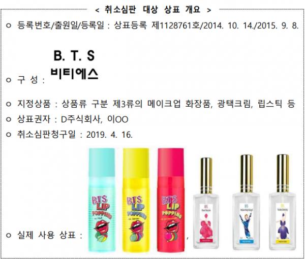 특허심판원은 최근 BTS의 소속사인 ㈜빅히트엔터테인먼트가 제3자가 메이크업 화장품 등에 사용하기 위해 등록한 상표권을 대상으로 청구한 취소심판에서 “상표권자가 고의로 등록상표와 유사한 상표를 사용함으로써 수요자에게 BTS와 출처의 오인·혼동을 불러일으키게 한 경우에 해당한다”라는 판단을 하고 해당 상표권을 취소하는 심결을 했다고 밝혔다.