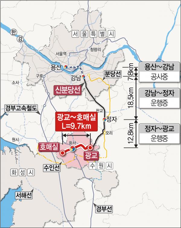 신분당선 광교~호매실 사업은 수원 광교중앙역에서 호매실을 잇는 약 9.7㎞의 철도로 인덕원~동탄선, 경부선과 연계된다.