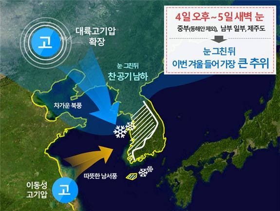 지상 부근으로 찬 대륙고기압이 확장하는 가운데, 대기 상공 5km 부근의 영하 30도 이하의 찬 공기까지 남하하면서 5일 아침 최저기온이 서울 영하 11도, 파주 영하 14도 등, 주로 중부지방을 중심으로 영하 10도 이하로 떨어지는 곳이 많겠으며 낮에도 기온이 영하권에 머문다.