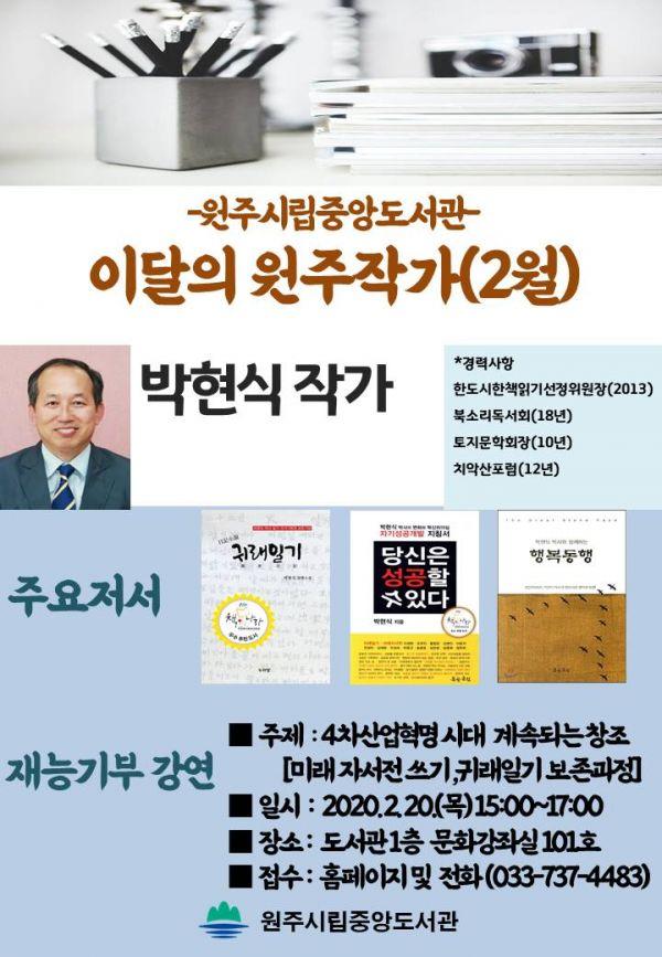 원주시립중앙도서관이 2월 이달의 원주작가로 ‘귀래일기’, ‘행복동행’, ‘미래자서전’ 등을 집필한 박현식 작가를 선정했다.