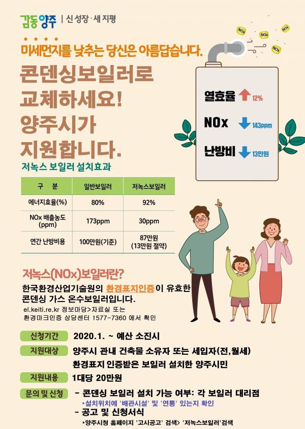 양주시는 대기질 개선을 위해 친환경 보일러 설치비용을 일부 지원하는 ‘가정용 친환경 보일러 설치 지원사업’을 시행한다고 밝혔다.