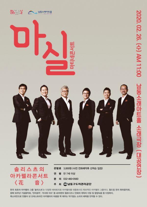 2020년의 첫 ‘마실’을 장식할 공연팀은 대한민국 1세대 아카펠라 그룹 ‘솔리스츠’로 1992년 한국 최초로 결성해 대중가요와 국악, 클래식과 재즈를 넘나드는 다양한 레퍼토리를 선보이며 아카펠라를 대중화시킨 한국의 독보적인 아카펠라 그룹으로 인정받고 있다.