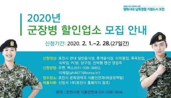 포천시는 2019년 시행된 ‘군장병 위수지역 폐지 및 평일 일과 후 병 외출 전면 허용’에 따라 지역 내에서 군 장병들의 소비를 촉진하고 지역경제 활성화에 기여하고자 ‘군장병 할인업소’를 선정해 운영하고 있다.