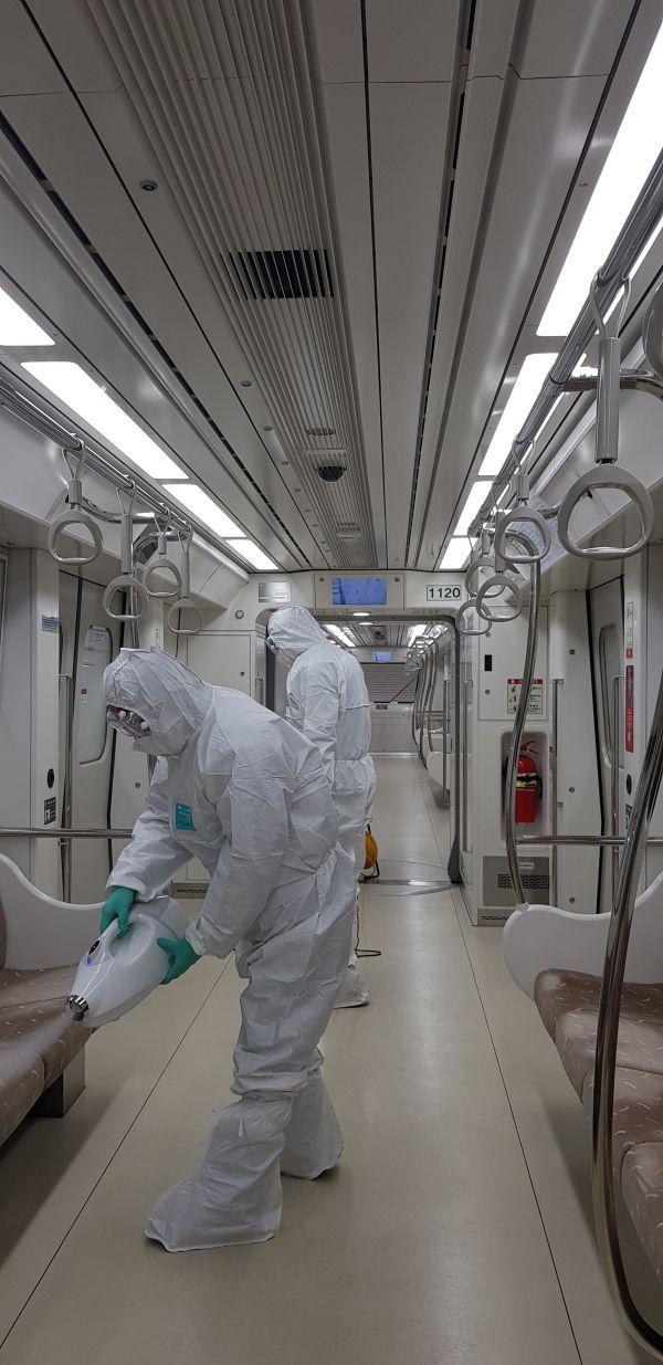 하루 6만여명이 이용하는 김포도시철도에는 살균제와 스팀살균기 5대를 지원해 엘리베이터, 에스컬레이터 핸드레일 등 승객들의 접촉이 많은 역사 내부와 차량 내부를 매일 소독할 수 있게 했다.