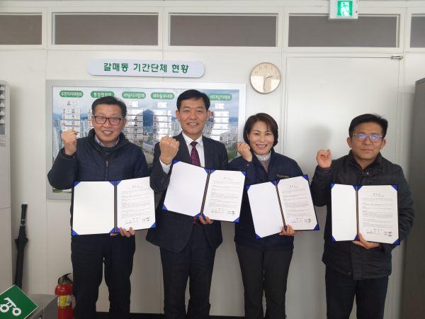 구리시 갈매동은 지난 3일 관내 3개 아파트 관리사무소와 ?행복한 일터, 쾌적하고 안전한 주거환경으로 근로자와 주민 모두가 행복한 아파트?를 조성하기 위한 ?The건강·The행복 아파트 만들기? 사업 업무 협약을 체결했다.