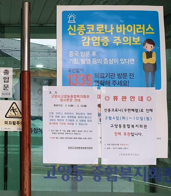 고양시는 신종 코로나바이러스 감염 예방 및 확산 차단을 위해 지난 4일부터 오는 10일까지 관내 동종합복지회관 8곳을 임시휴관한다고 밝혔다.
