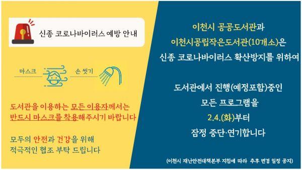 이에 따라, 이천시립도서관[이천시 공공도서관 및 공립 작은도서관]은 신종 코로나바이러스 확산 방지를 위해 진행중인 모든 프로그램을 2월 4일부터 잠정 중단· 연기한다.