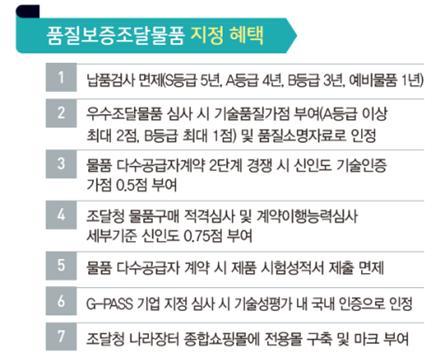 지정되면 납품검사 면제, 우수제품 심사 가점 등 다양한 혜택