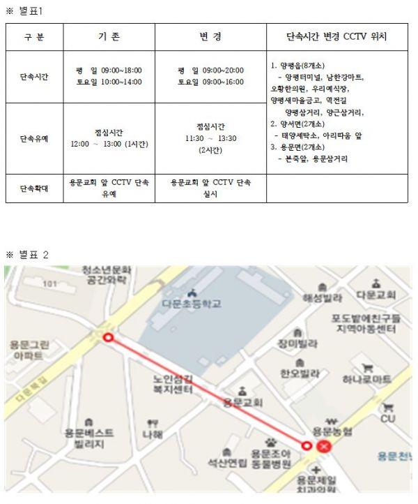 양평군은 시가지 교통 혼잡지역에 CCTV 단속이 중지되는 오후 6시 이후 무질서한 교통 환경으로 주민불만이 가중됨에 따라 CCTV 단속시간을 평일 오전9시부터 오후8시까지, 토요일 오전9시부터 오후4시까지 2시간 연장 운영하고 점심시간대에는 단속유예시간이 1시간으로 짧아 식당 등을 이용하는 주민 및 업주들의 불만이 지속적으로 대두돼 점심시간대 단속유예를 오전 11시30분부터 오후 1시 30분까지로 기존보다 1시간 연장된 2시간으로 운영한다.