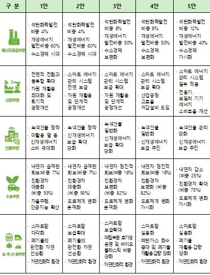 5가지 복수안은 2017년 우리나라 온실가스 배출량을 기준으로 2050년까지 최대 75%에서 최저 40%를 줄이는 것이다.