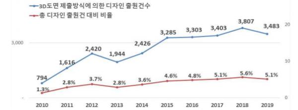 3D도면 제출방식에 의한 디자인출원은 우리나라에서 지난 2010년에 전 세계 최초로 시작했고 출원건수는 794건을 시작으로 2019년 3483건으로 그간 꾸준히 증가추세를 보이고 있는 것으로 나타났다.