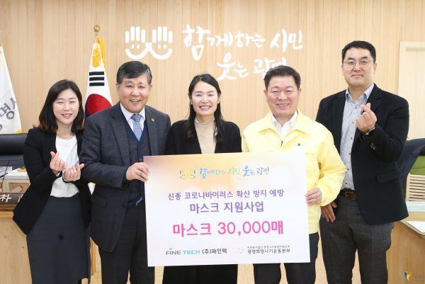 광명시는 지난 5일 ㈜파인텍에서 신종 코로나바이러스 확산 방지를 위해 마스크 3만 매를 사회복지 협의회-광명희망나기운동본부에 전달했다고 밝혔다.
