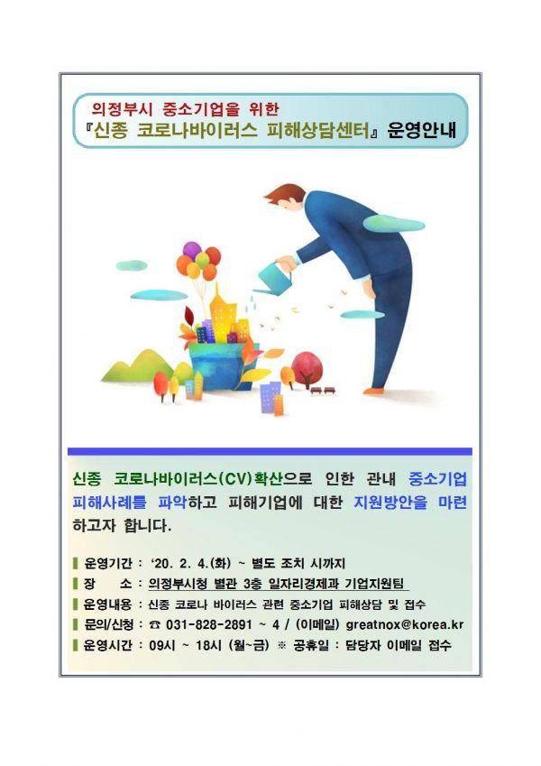 의정부시는 중국 신종 코로나바이러스 감염증의 영향으로 관내 기업들의 피해가 우려됨에 따라 피해상담센터를 설치하고 이를 적극 활용할 수 있도록 온·오프라인을 통한 홍보에 나서고 있다.