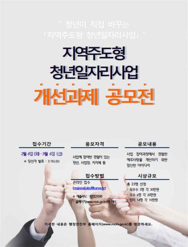 행정안전부는 6일부터 오는 3월 6일까지‘지역주도형 청년일자리 사업’개선과제 공모전을 실시한다.