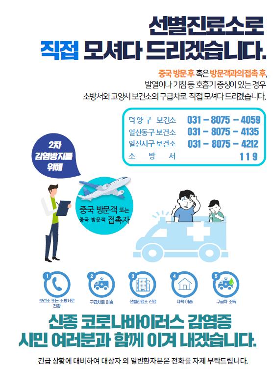 신종 코로나바이러스 감염증이 중국 전역으로 확산되면서 중국을 방문하고 발열과 호흡기 증상이 있을 시 고양시 보건소와 소방서에 연결하면 구급차로 직접 관내 선별진료소를 모셔다드려 지역사회의 확산을 방지하기 위한 서비스다.
