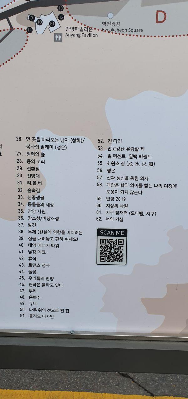 QR코드 부착된 곳은 종합안내판, 안양박물관, 안양사, 안양파빌리온, APAP작품인 ‘나무위의 선으로 된 집’ 등이다.