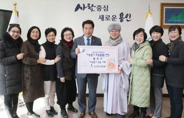 이날 처인구 이동읍 소재 사찰인 동도사의 도원스님과 신도들이 백군기 시장실을 방문해 어려운 이웃을 위해 써 달라며 300만원의 성금을 기탁했다.