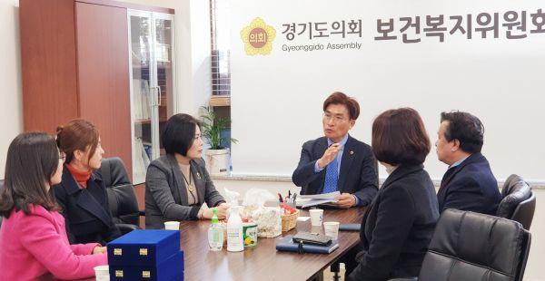 정희시 경기도의회 보건복지위원장과 권정선 의원은 지난 4일 오후 보건복지위원실에서 경기도사회복지관협회 임원진과 신종 코로나 바이러스와 관련한 사회복지관 현안 간담회를 가졌다.