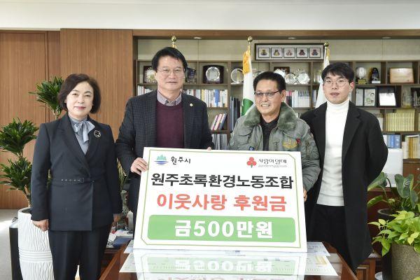 원주초록환경노동조합은 지난 6일 원주시장 집무실에서 이웃사랑 후원금 500만원을 기탁했다.