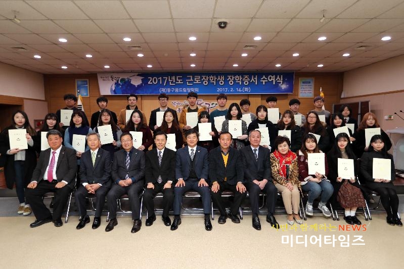 [미디어타임즈=문상수 기자] 인천 동구(구청장 이흥수)는 지난 14일, 지하대회의실에서 2017년도 근로장학생 장학증서 수여식을 개최했다.이번 근로장학생 선발 사업은 동구꿈드림장학회에서 처음 추진한 장학사업으로 대학생들이 동구 관내 행정기관 및 각종 사회복지시설 업무에 직접 참여하고 장학금을 지급받음으로써 대학생들에게 다양한 직업 체험의 기회를 경험하고 재정자립심을 향상시키고자 시행되었다.이날 근로장학생으로 선발된 29명의 대학생들은 장학증서와 장학금 총3천7백여 만원을 수여받았다. 행사에 참석한 이흥수 동구청장은 인사말에서 “많은 분들의 도움으로 장학생에 선발된 학생에게 장학금을 지급하게 되었다.”며 “도움을 주신분의 뜻에 어긋나지 않도록 학업에 열중하여 꼭 동구의 이름을 드높일 수 있는 동구꿈드림장학회 장학생이 되길 바란다”고 말했다.한편, 2015년에 출범한 (재)동구꿈드림장학회는 현재까지 1,814명에게 7억1천 여 만원의 장학금을 지원을 하였다.