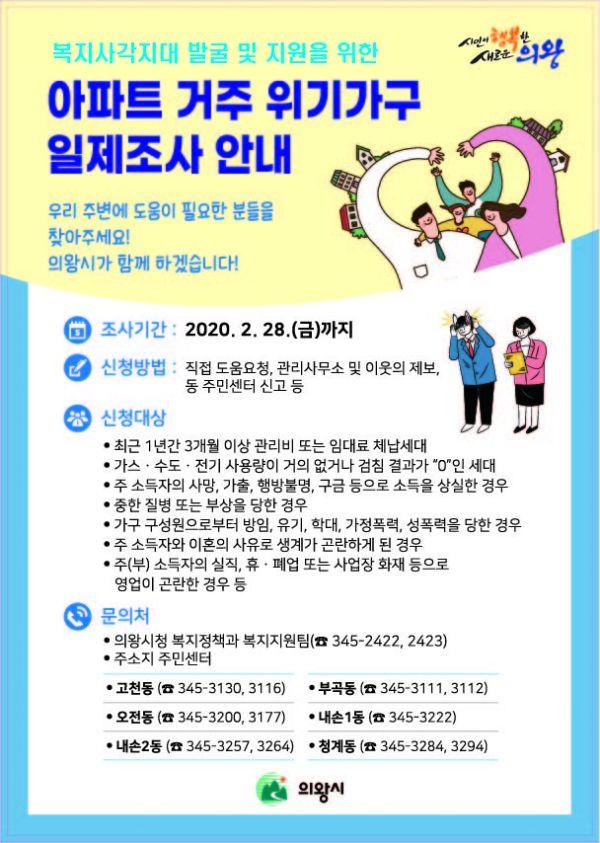 의왕시는 연중 복지사각지대 상시 발굴체계를 운영함에도 경제적 어려움으로 추정되는 사건이 지속적으로 발생함에 따라 복지사각지대를 집중적으로 발굴하기 위해 2월 말까지 아파트 거주 위기가구 일제조사를 실시한다고 밝혔다.
