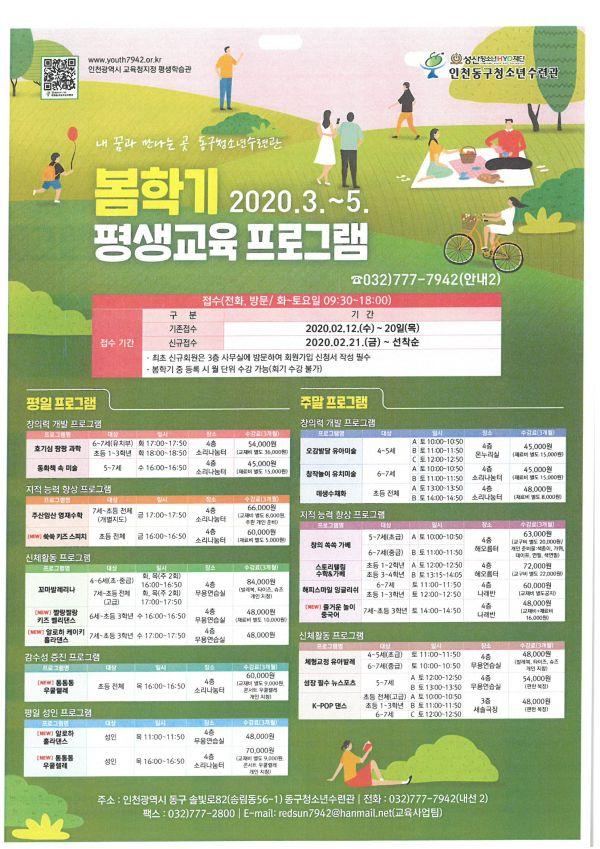 인천동구청소년수련관은 2020년 봄학기를 맞이해 유아, 아동, 청소년을 대상으로 한 다양한 평생교육 프로그램을 진행 할 예정이다.