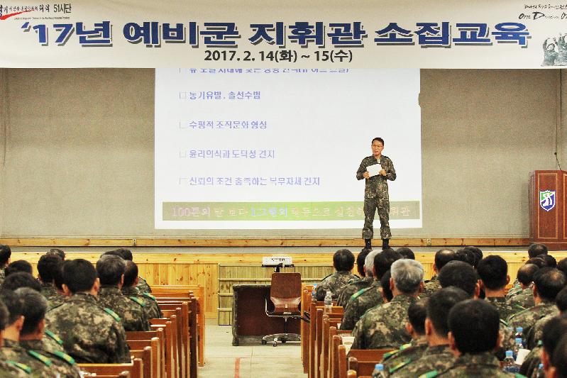 교육 1일차에는 마인드변화 감정코칭에 대한 초빙교육과 동원참모에 의한 '17년 예비군 교육훈련 지침 및 방향에 대한 설명이 있었으며, 2일차에는 사단장 정신교육과 예비군 정예화를 위한 초빙강연, 예비군 교육훈련 발전방안 토의, 애로 및 건의사항 수렴 등 참석자 모두가 시종일관 진지하고 열띤 분위기 속에서 진행됐다.