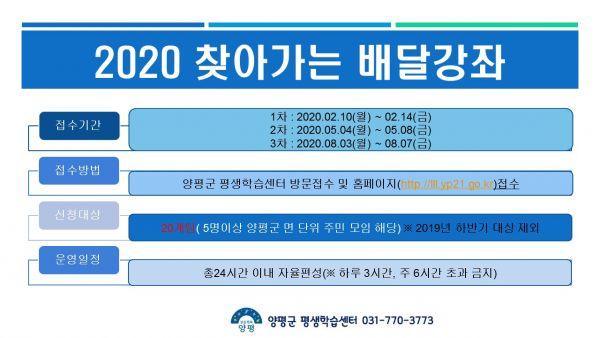지역 주민들이 원하는 시간과 장소에 강좌를 무료로 지원하는 '배달강좌'는 3회로 진행되며 2차 접수는 5월 첫째주, 3차 접수는 8월 첫째주에 진행될 예정이다.