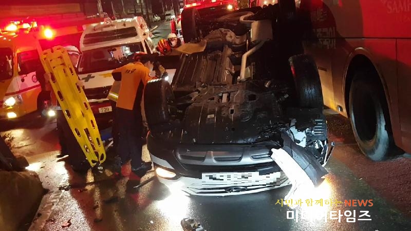 | 작전고가교 SUV차량 전복 1명 구조현장. <ⓒ미디어타임즈> |