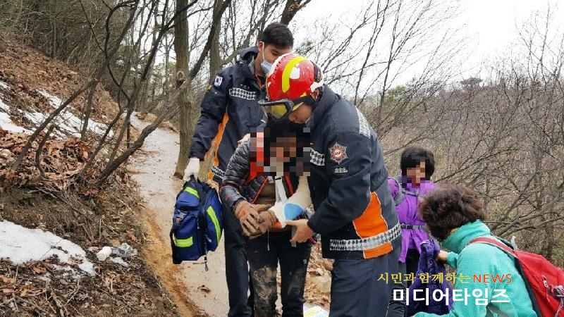 | 원적산서 50대 여성 산악사고 1명 구조모습. <ⓒ미디어타임즈> |