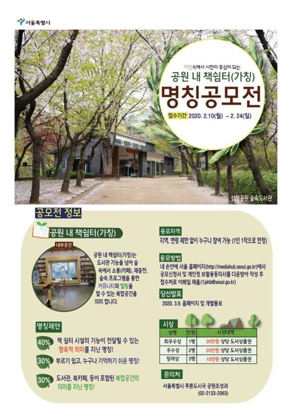 서울시는 시민들이 공원 내 숲속에서 편하게 쉬고 재충전 할 수 있는 힐링 복합공간인 ‘공원 내 책쉼터’를 2023년까지 20개소를 건립하기로 했으며 공식 명칭 선정을 위한 공모를 오는 24일까지 진행한다고 밝혔다.