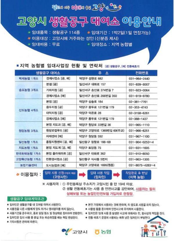 또한 고양시 지역 8개 농협에서 생활공구 114종을 시민에게 무상으로 대여하고 있다.