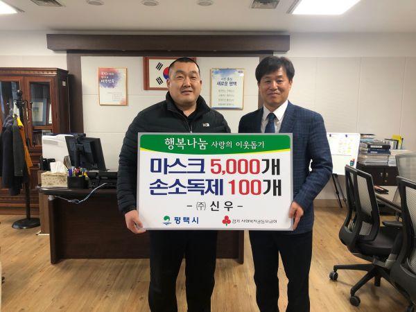평택시 팽성읍에 위치한 ㈜신우는 12일 신종 코로나바이러스 감염병 예방 및 확산 방지를 위해 송탄출장소를 방문해 어린이용 마스크 5,000개와 손소독제 100개를 기부했다.