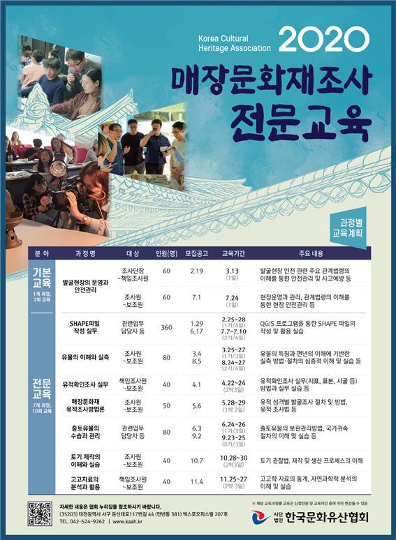 문화재청과 한국문화유산협회는 매장문화재조사 전문인력을 양성하고 재교육을 통한 전문성과 역량 강화를 위한 ‘2020년도 매장문화재조사 전문교육’을 2월부터 11월까지 실시한다.