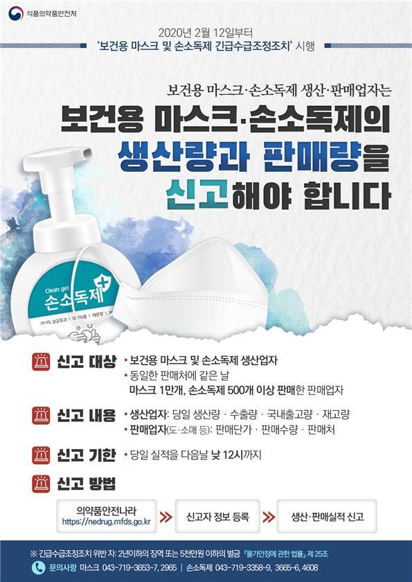 식품의약품안전처는 신종 코로나바이러스로 인한 보건용 마스크와 손소독제의 품귀현상으로 국민적 우려가 커짐에 따라, 물가안정에 관한 법률 제6조에 의거 ‘보건용 마스크 및 손소독제 긴급수급조정조치 고시’를 12일 0시부터 시행한다.