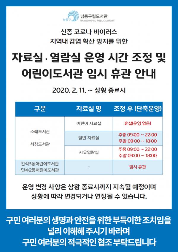 소래와 서창도서관은 감염에 취약한 어린이 자료실에 대해 휴실로 운영을 중단하며 종합자료실 및 자유열람실은 주중 9시부터 오후 10시, 주말 9시부터 오후 6시까지 단축 운영한다.