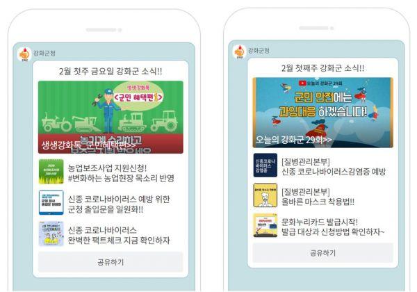 강화군이 가장 대중적이고 간편한 메신저인 ‘카카오톡’ 등을 활용해 군민 혜택 중심의 군정 홍보를 펼치고 있어 주민들의 큰 호응을 얻고 있다.