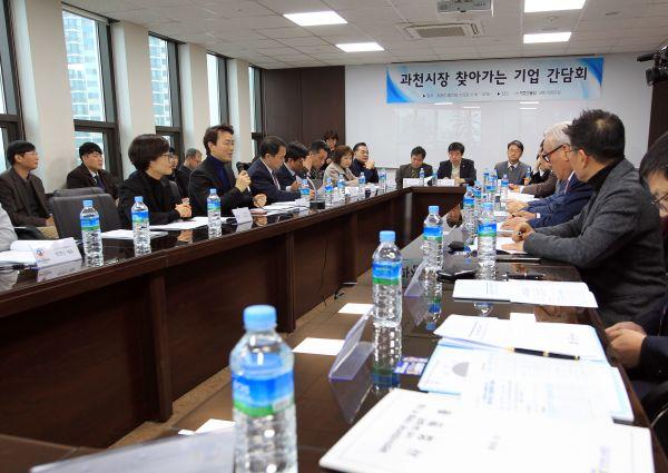 12일 과천시에 따르면, 김 시장은 안양시에 소재한 ㈜서현기술단 회의실에서 과천지식정보타운 입주 예정 기업인 ㈜서현기술단, 펄어비스, 코오롱글로벌 등 20개 업체 대표, 관계 공무원 등과 함께 과천시와 기업 간의 상생협력을 위한 방안에 대해 논의하고 상생협력과 동반성장을 도모하는 시간을 가졌다.